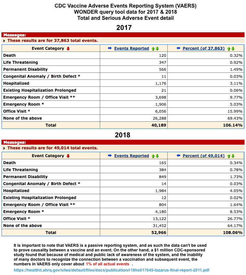 - CDC VAERS (Vaccine Adverse Events Reporting System) data: Totals and Serious Adverse Events, 2017-2018