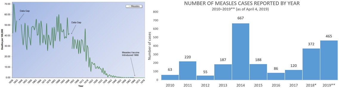 Although technically "eliminated" — i.e., not circulating — the number of cases in the U.S. varies from year to year, averaging around 220 from 2010-2018, though higher this year. [18]