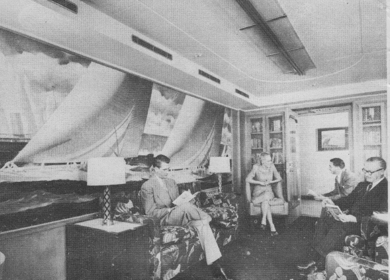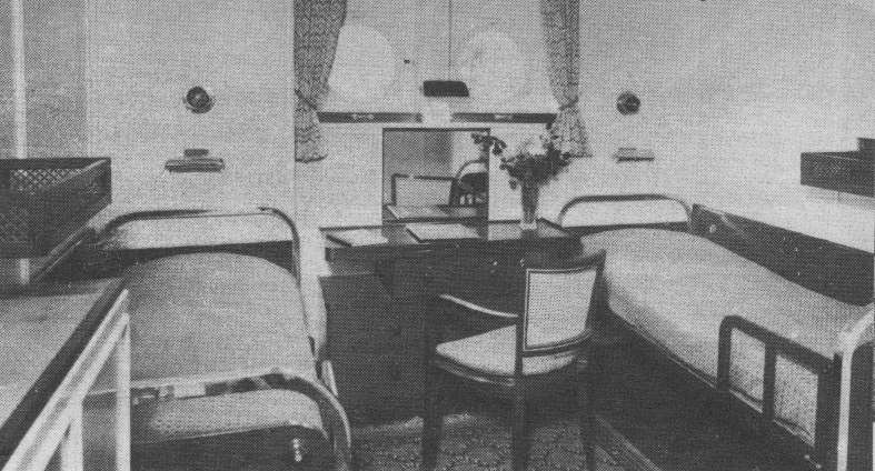 Of these staterooms Marine Engineering and Shipping Review reported: "Furniture and transom seats (nautical for sofas) are upholstered with foamed sponge rubber... The color scheme of the staterooms is carefully planned. Airports and doors are draped and the deck laid with fitted carpets. Suitable lighting is provided for night reading and deck as well as ceiling lighting." Again, we have purposely quoted the matter-of-fact description of an engineer or designer; those are not the glossy words of the advertising copywriter or travel agent that one is accustomed to reading.