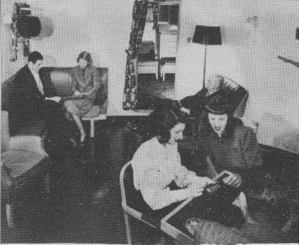 The stateroom, the passenger's home afloat, has not been overlooked. Great strides have been made toward a true double-purpose cabin, a private living room by day that becomes a bedroom by night at the touch of buttons. Sofa beds and flush wall or ceiling pullmans give a feeling of unobstructed space for lounging and living that belies the dual purpose. At night with the push of a button the back of a sofa folds down to become a bed of foam rubber, another button brings a pullman-type berth hidden in the wall above into sleeping position. Sometimes the rooms are divided by partial partitions into two sections, one for living, another for sleeping.