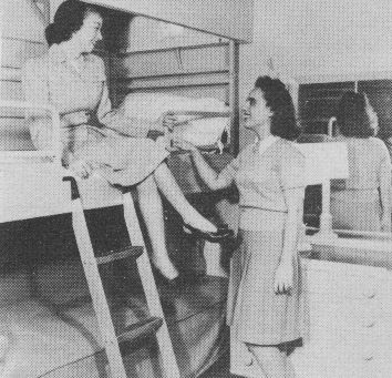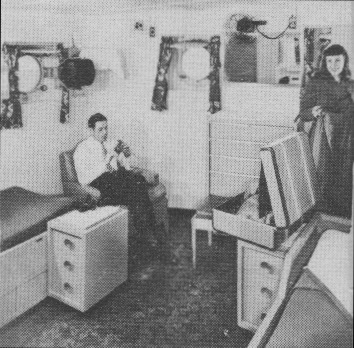 picture at left illustrates the new pullman type berth which lowers from a flush position in ceiling.