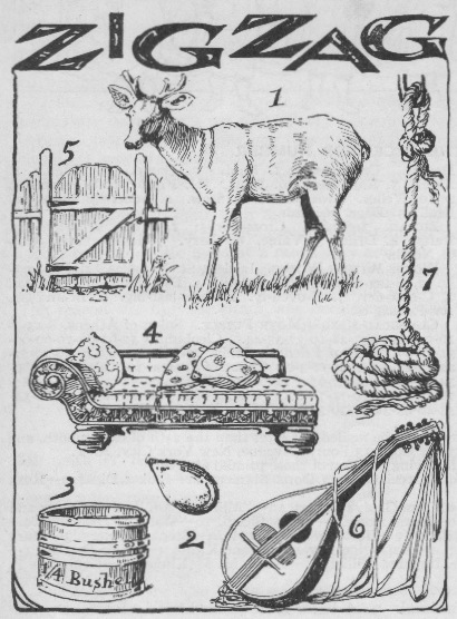 All of the seven pictured objects may be described by words of equal length. When rightly guessed and written one below another, the zigzag (beginning at the upper left-hand letter and ending with the lower left-hand letter) will spell the surname of an American naval officer who was born in January. He was killed in a duel.