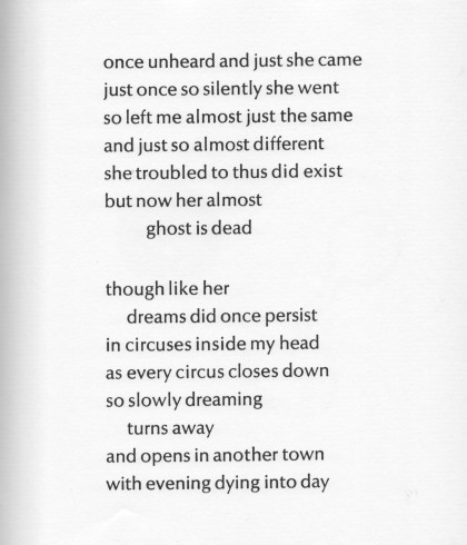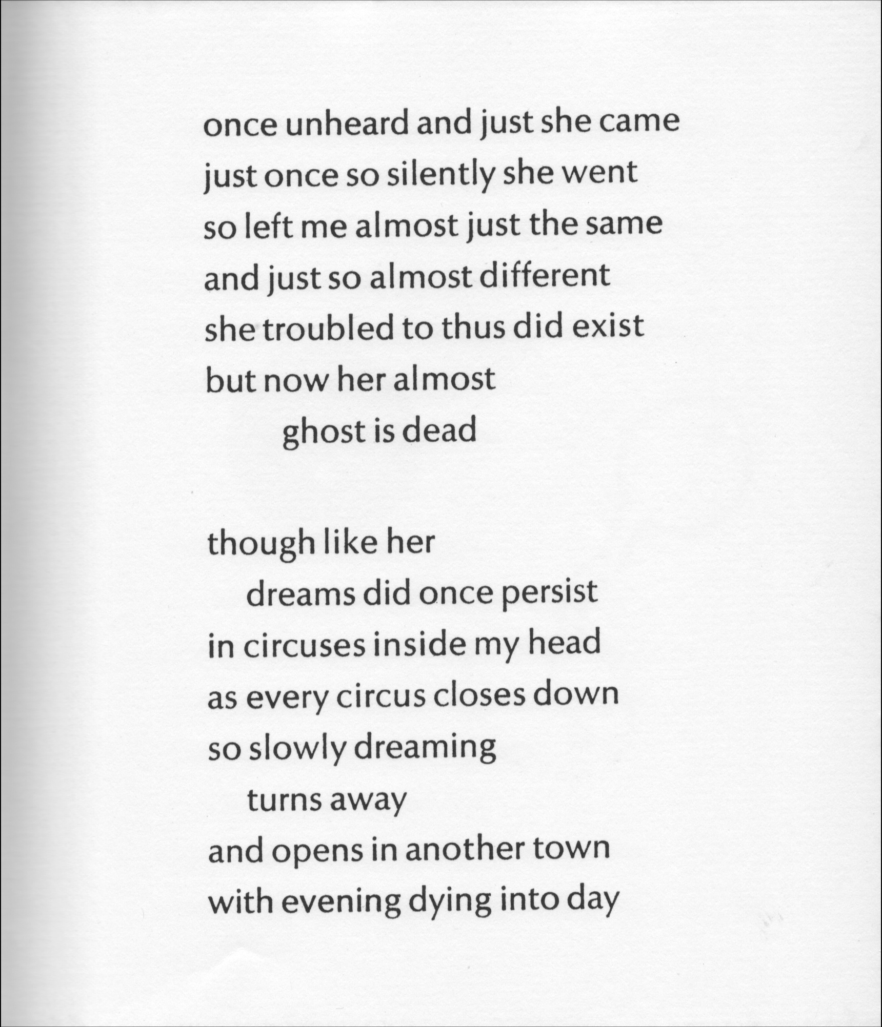 once unheard and just she came just once so silently she went so left me almost just the same and just so almost different she troubled to thus did exist but now her almost ghost is dead though like her dreams did once persist in circuses inside my head as every circus closes down so slowly dreaming turns away and opens in another town with evening dying into day |