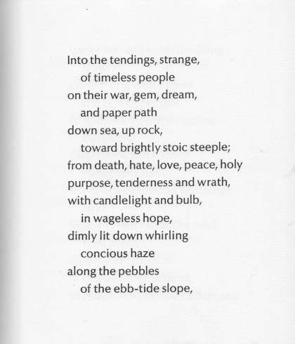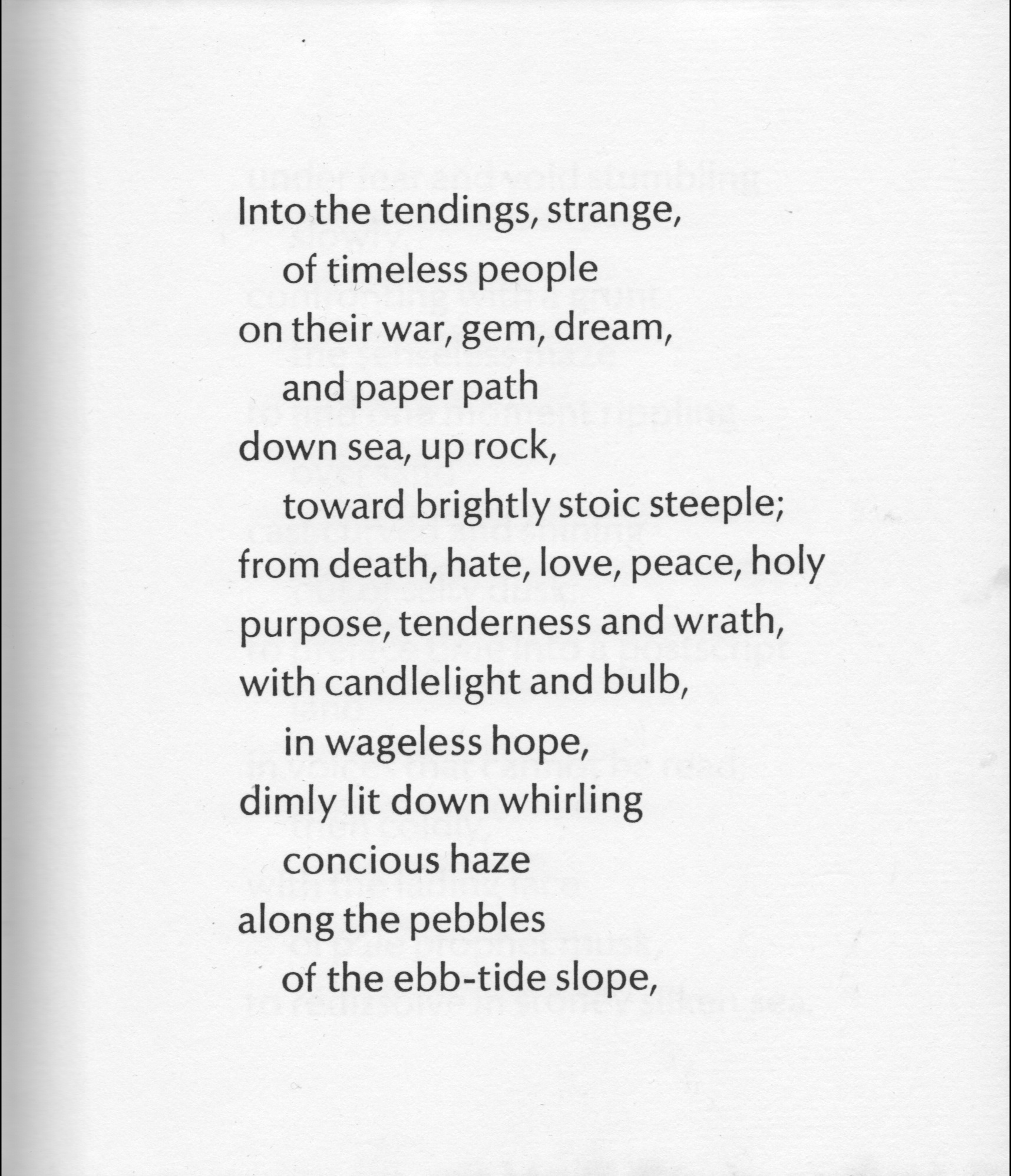 Into the tendings, strange, of timeless people on their war, gem, dream, and paper path down see, up rock, toward brightly stoic steeple; from death, hate, love, peace, holy purpose, tenderness and wrath, with candlelight and bulb in wageless hope, dimly lit down whirling conscious haze along the pebbles of the ebb-tide slope, |