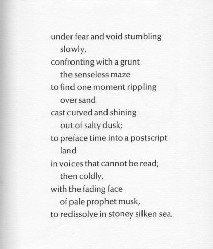 under fear and void stumbling slowly confronting with a grunt the senseless maze to find one moment rippling over sand cast curved and shining out of salty dusk; to preface time into a postscript land in voices that cannot be read; then coldly, with the fading face of pale prophet musk, to redissolve in stoney silken sea. |