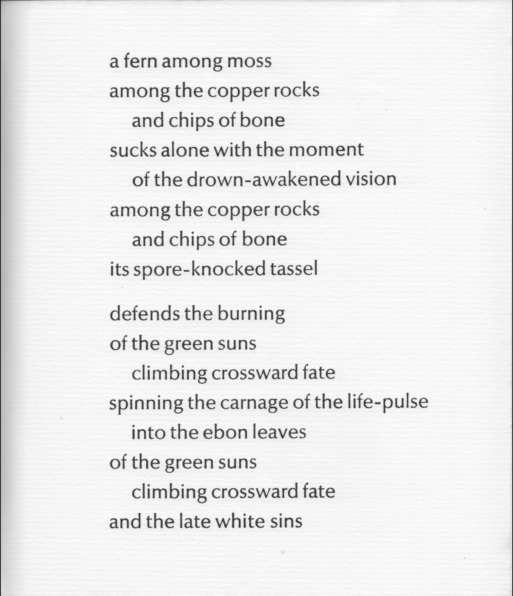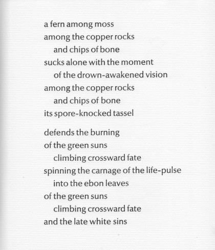 a fern among moss among the copper rocks and chips of bone sucks alone with the moment of the drown-awakened vision among the copper rocks and chips of bone its spore-knocked tassel defends the burning of the green suns climbing crossward fate spinning the carnage of the life-pulse into the ebon leaves of the green suns climbing crossward fate and the late white sins |