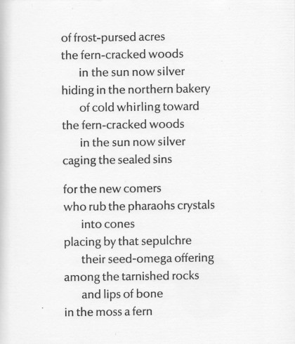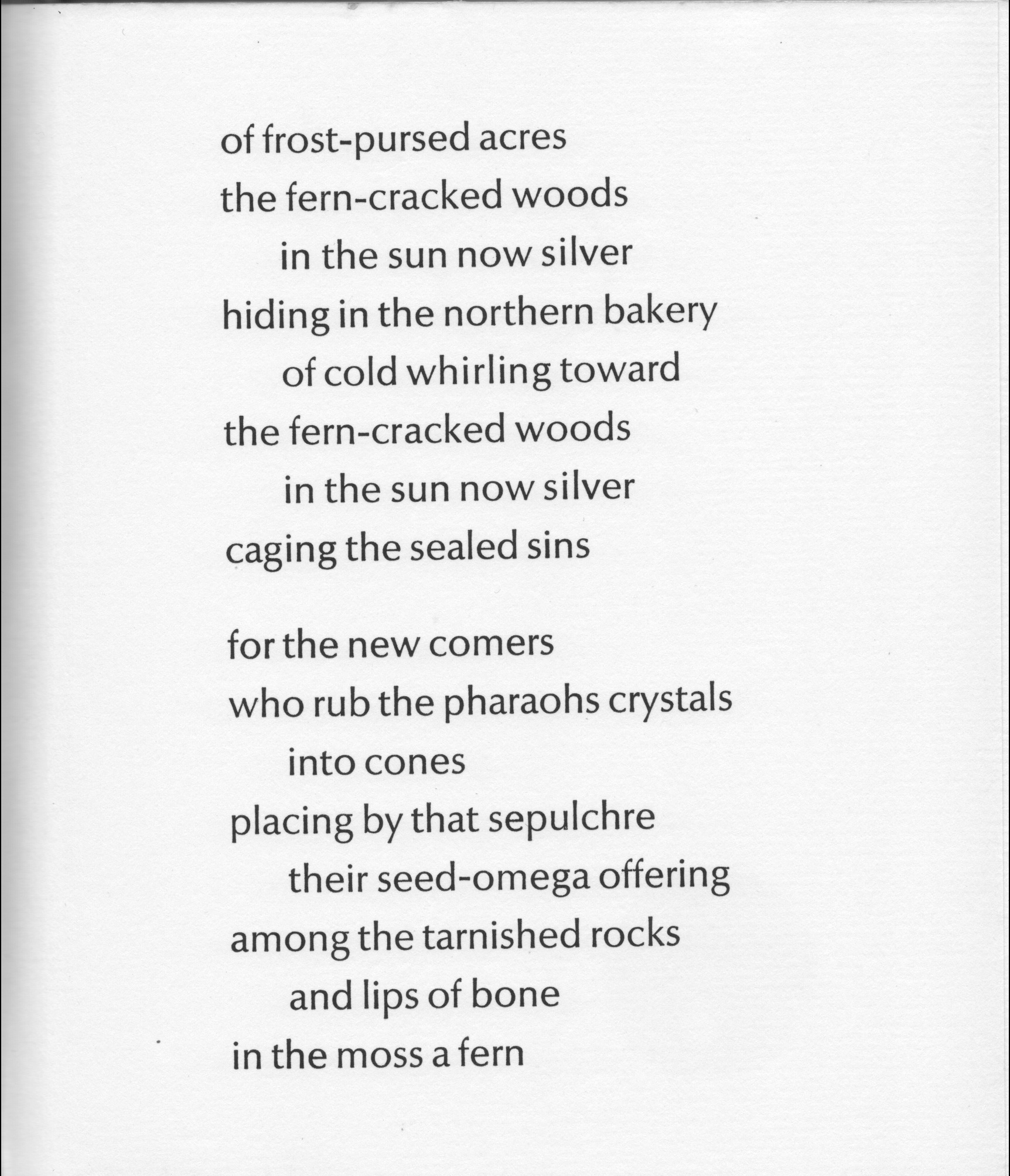 of frost-pursed acres the fern-cracked woods in the sun now silver hiding in the northern bakery of cold whirling toward the fern-cracked woods in the sun now silver caging the sealed sins for the new comers who rub the pharaohs crystals into cones placing by that sepulchre their seed-omega offering among the tarnished rocks and lips of bone in the moss a fern |