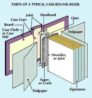 The pages were printed in pre-calculated pairs to allow folding and then sewing of "signatures". There was some book-binding equipment at the print shop. I did the book binding by hand as shown here. I don't remember all of how it went. It wasn't quite like all these videos, but I vaguely remember some aspects of it. At the left is a diagram of the layers of binding. On the right is one version of how the sewing is done and how the gluing is done -- although I also glued on the leatherette cover early on and then the end papers (wallpaper) at the end.