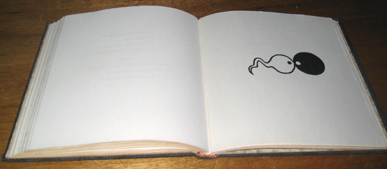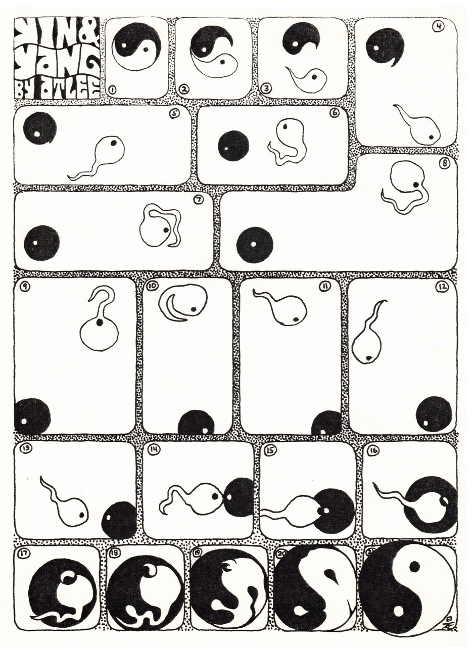| The yin-yang series I had dreamed up earlier in pen-and-ink in a notebook. I decided to combine them with poems I had written in the last five years or so before that. The pictures were carved into linoleum blocks, something I'd never done before, but found to be very enjoyable, requiring a lot of care, control and concentration, but being much more controllable and responsive than wood blocks. The blocks were actually a layer of linoleum glued onto a wooden block, and the carving was done with a set of mostly v-shaped blades (with U-shaped blades for cutting away more of the block). I actually took the print pages home to the commune and did the linoleum block printing at home. At the right is an example of how to do linoleum block printing. I could only do one or a few pages each day because I'd have the pages draped all over the living room drying! |