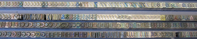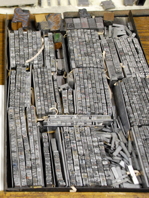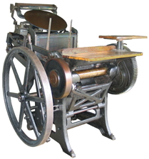 We had very old type cases -- boxes of type, leading, and brass and copper spacers, that looked sort of like those on the left, and the press I/we used looked something like the one on the right. I could set the speed of the rollers so that I would have time to put the paper in place before the inked print was pressed onto the paper. I became better and faster with this process over time. I also became faster and better at setting type in a composing stick (below) | ![]() |