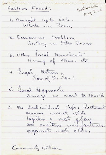 These are notes apparently taken during a meeting the mayor had with restaurant and/or cafe owners who were justifiably concerned about what was going to happen in the aftermath of the fire-bombing/shooting the previous weekend and the desegregation effort at the library the day before. |