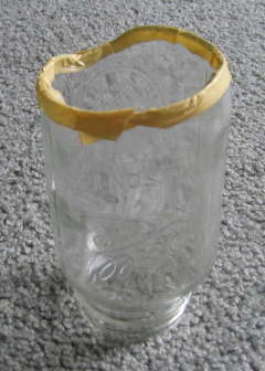Windproofing -- You can make a windproof snow lantern by setting down an oil-lamp chimney, available from most hardware stores, around the candle (see The Base and Other Equipment, above). If you can't find a lamp chimney, you can make a serviceable one by cutting the bottom off a suitable-sized jar, such as a quart canning jar (left). You can do this by tying a piece of string tightly around the jar where you want the cut to be, soaking the string with lighter fluid, igniting it and letting it burn for several seconds, and then dipping the jar into cold water. The bottom will normally crack right off, and you can mold masking tape around the edge to prevent cuts. Lighting the candle in wind -- Lighting the candle first and then setting the protector around it is easy, unless the wind insists on instantly blowing the candle out. You can light the candle inside the protector using a long match, or a kitchen tongs holding a match, but more than likely the wind will blow the match out first. To get around this, you can light the candle inside the house, hold it with a tongs inside the protector (right) while you carry it outside to the lantern and place it in the holder, and then quickly flip the protector into place. |