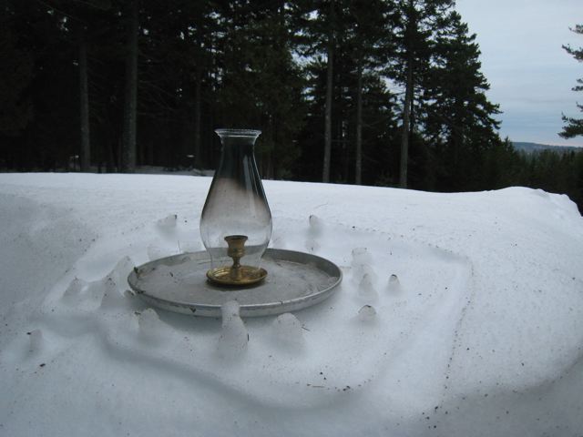 Make sure that you put the snow lantern where you can see it from a window, and, if you want to share it, where passers-by can see it. You need a flat, horizontal area at least 15" in diameter. Shelter from wind can be a help. (But see Portability, next.)