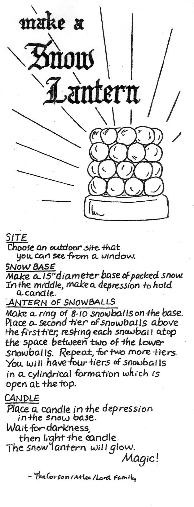 What has happened? Is this walk-by psychotherapy? :-) No -- or perhaps yes. This person has just noticed the snow lantern you've built in front of your home. If this hasn't happened to you, it could. It really is remarkable how much people appreciate encountering the gentle, unexpected beauty of snow lanterns. A simple cylinder of snowballs, with the yellow light of a candle flickering inside and glowing out through the thick and thin of the snowballs, a snow lantern is easy to make. All you need is snow. And a candle. |